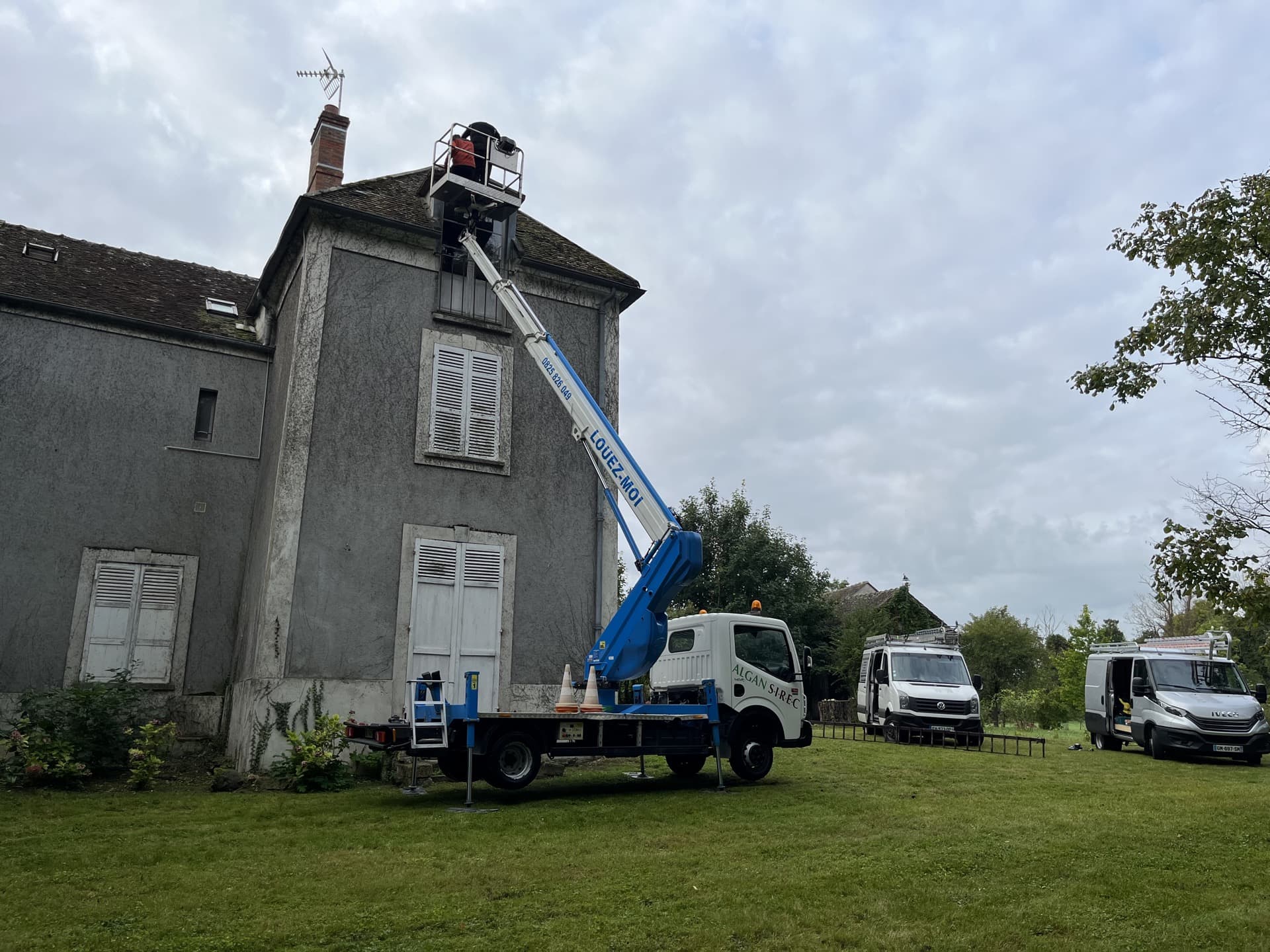 Nous sommes intervenus en Seine-et-Marne en 2023 pour effectuer un nettoyage de toiture avec l'aide d'un camion-nacelle.